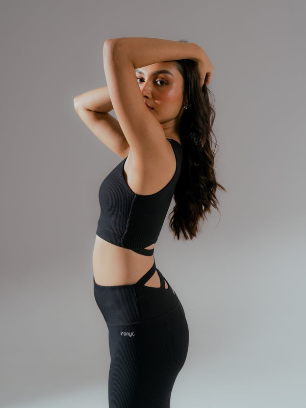 Nyx Cipher is an expressive coordinated set designed for women who move with confidence and intention. Combining a sculptural tank top with precision-cut leggings, this black-on-black silhouette blends structure, rhythm, and fluid movement into one elevated performance look.